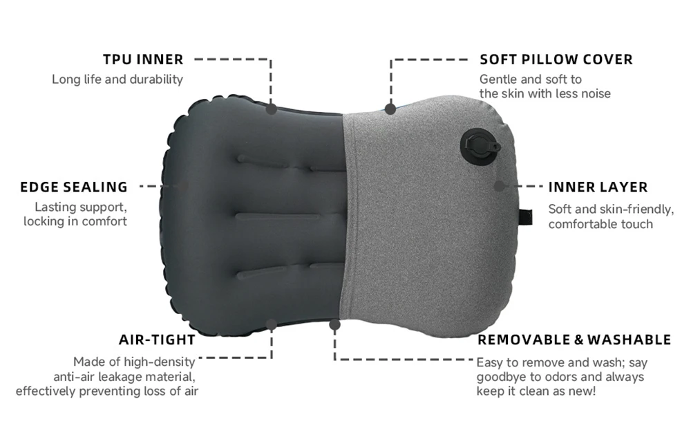 2.【BREATHABLE AIRFLOW FABRIC & WASHABLE COVER】Hypoallergenic inflatable pillow case with sweat-wicking cotton exterior + noise-free polyester inner. Removable for machine wash (ideal for camping air pillow).