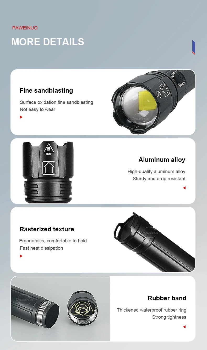 * It has five-speed modes, high-light/medium-light/low-light/explosive flash/SOS switch at will to meet the needs of different scenarios. It also has the function of telescopic zoom, and freely adjusts the focal length, allowing you to easily deal with long and close-up views and do whatever you want!